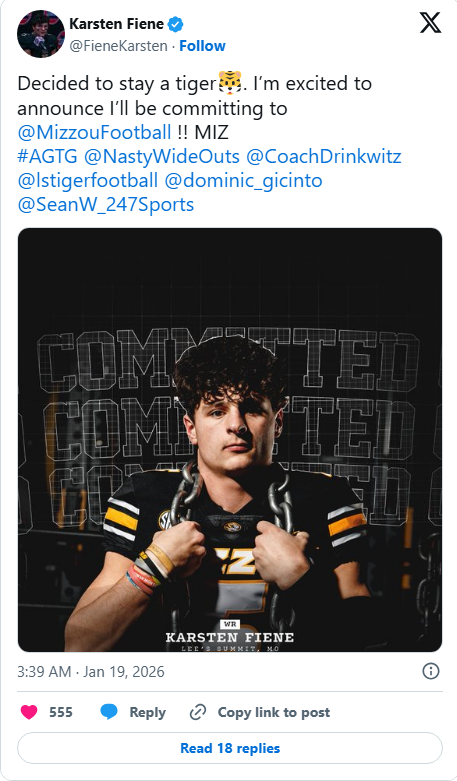 With Fiene’s pledge, Missouri now sits at 21 commitments in its 2026 class, continuing to quietly add upside and depth while blending portal experience with high school talent.